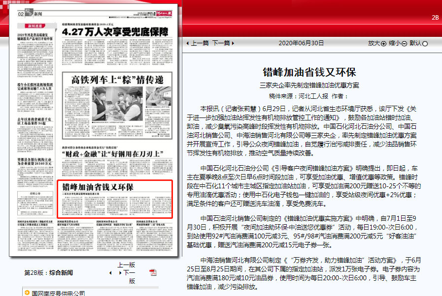 中海油销售河北有限公司制定《“万券齐发,助力错峰加油”活动方案》,于6月25日至8月25日期间,在其公司下属的指定加油站,派发1万张电子券。电子券内容为汽油消费满180元减10元油品券,使用时间为每日20:00-次日6:00,引导、鼓励车主错峰加油,减少污染排放。