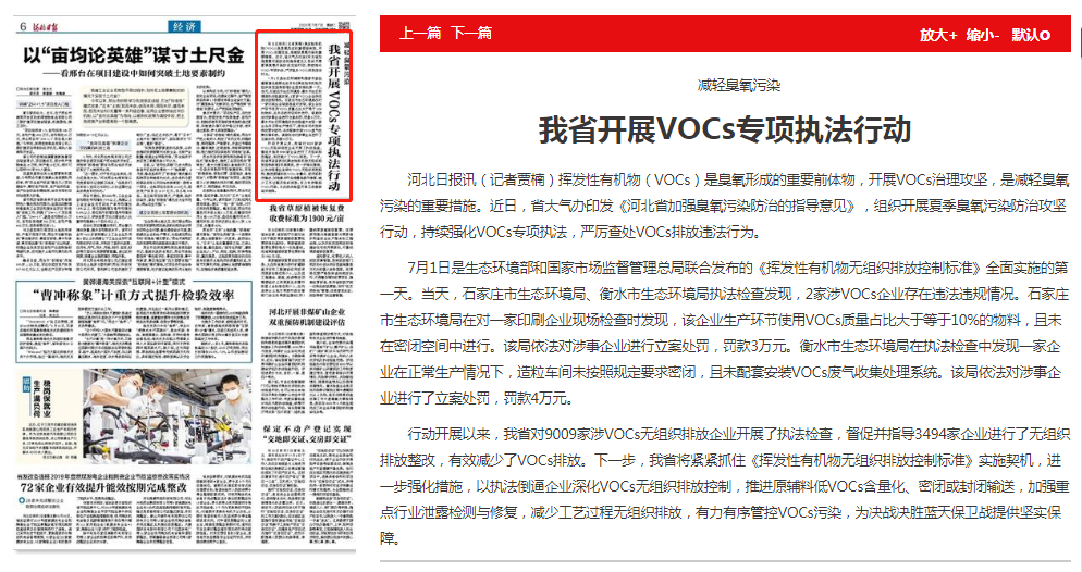 7月1日是生态环境部和国家市场监督管理总局联合发布的《挥发性有机物无组织排放控制标准》全面实施的第一天。当天,石家庄市生态环境局、衡水市生态环境局执法检查发现,2家涉VOCs企业存在违法违规情况。石家庄市生态环境局在对一家印刷企业现场检查时发现,该企业生产环节使用VOCs质量占比大于等于10%的物料,且未在密闭空间中进行。该局依法对涉事企业进行立案处罚,罚款3万元。衡水市生态环境局在执法检查中发现一家企业在正常生产情况下,造粒车间未按照规定要求密闭,且未配套安装VOCs废气收集处理系统。该局依法对涉事企业进行了立案处罚,罚款4万元。