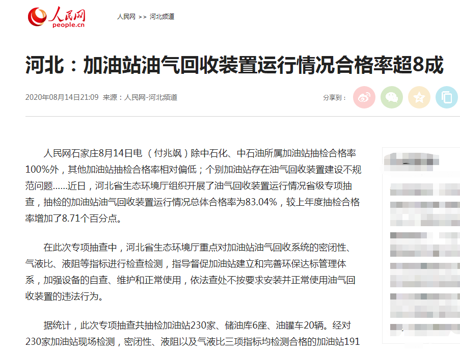 人民网:河北 加油站油气回收装置运行情况合格率超8成