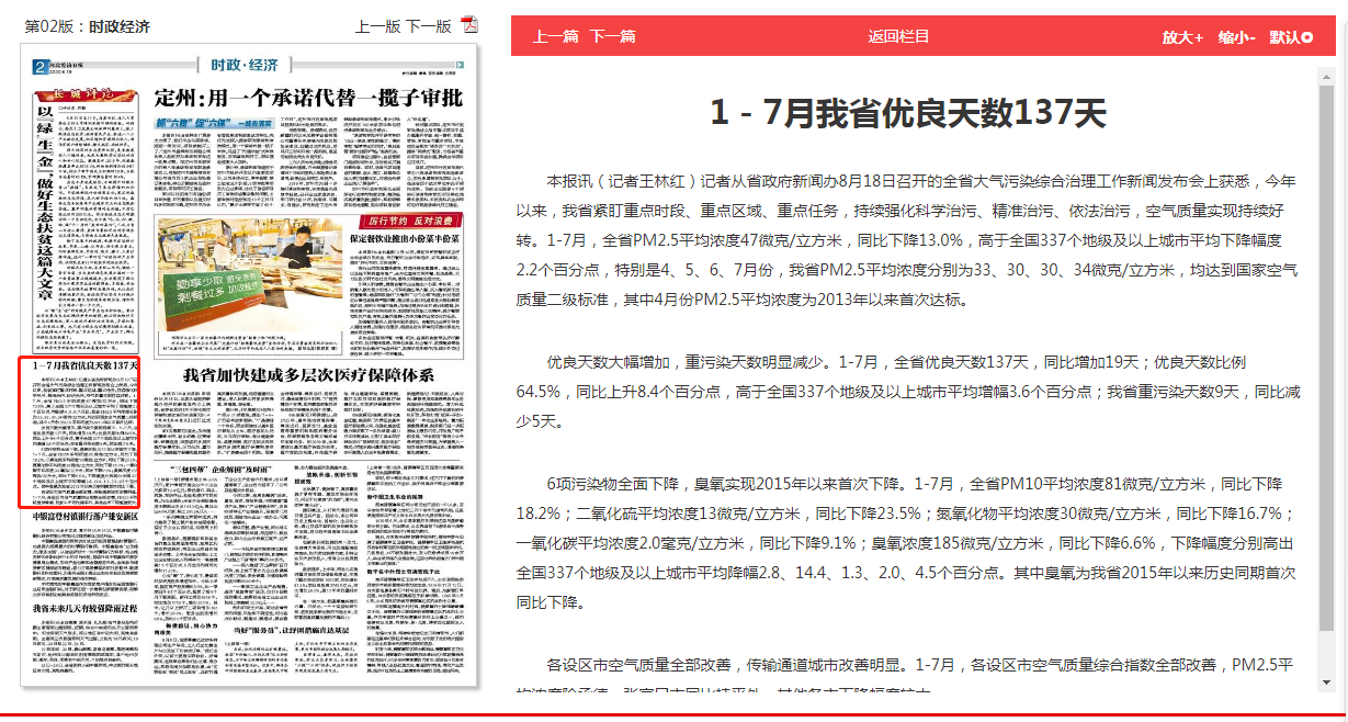 优良天数大幅增加,重污染天数明显减少。1-7月,全省优良天数137天,同比增加19天;优良天数比例64.5%,同比上升8.4个百分点,高于全国337个地级及以上城市平均增幅3.6个百分点;我省重污染天数9天,同比减少5天。