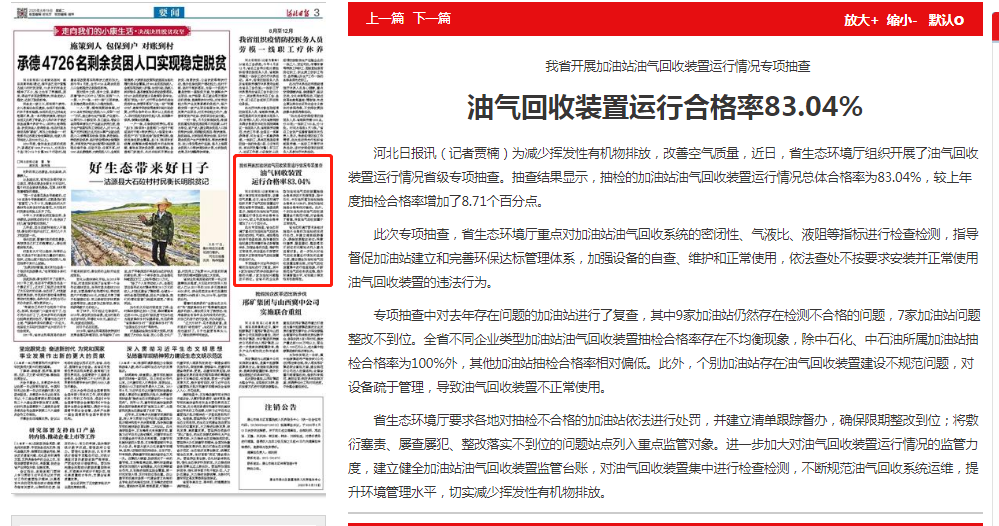河北日报讯(记者贾楠)为减少挥发性有机物排放,改善空气质量,近日,成人视频 组织开展了油气回收装置运行情况省级专项抽查。抽查结果显示,抽检的加油站油气回收装置运行情况总体合格率为83.04%,较上年度抽检合格率增加了8.71个百分点。