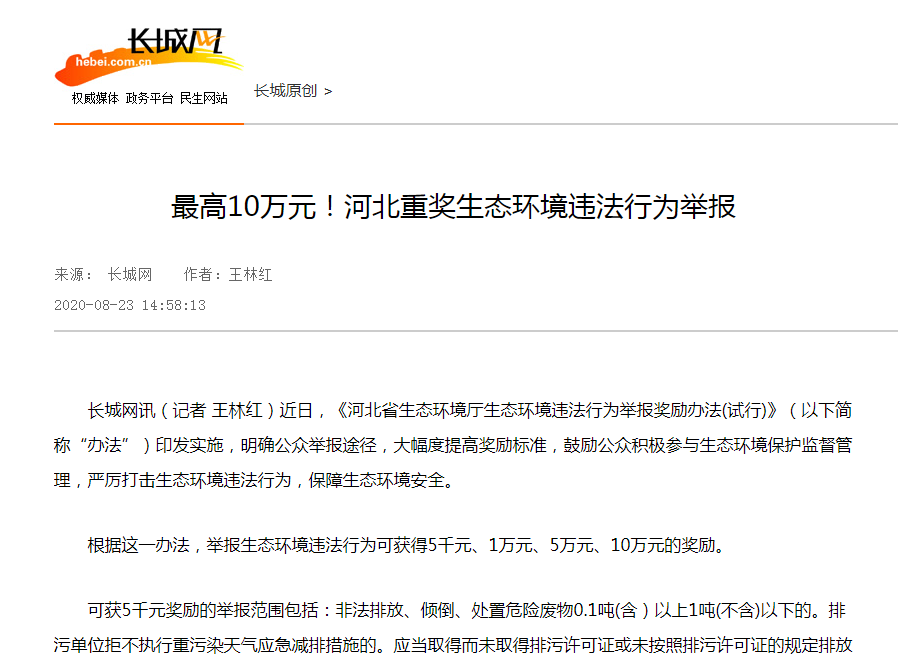 这一办法实施的同时,2018年6月1日起施行的《河北省环境保护厅环境污染举报奖励办法》(冀环办函【2018】589号)予以废止。