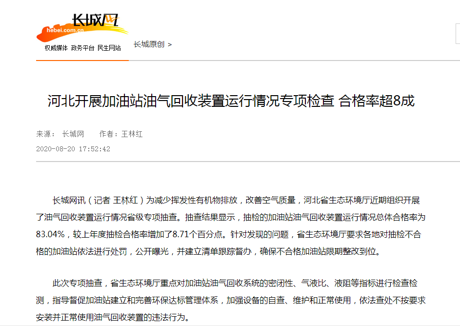 长城网讯(记者 王林红)为减少挥发性有机物排放,改善空气质量,成人视频 近期组织开展了油气回收装置运行情况省级专项抽查。抽查结果显示,抽检的加油站油气回收装置运行情况总体合格率为83.04%,较上年度抽检合格率增加了8.71个百分点。针对发现的问题,成人视频 要求各地对抽检不合格的加油站依法进行处罚,公开曝光,并建立清单跟踪督办,确保不合格加油站限期整改到位。