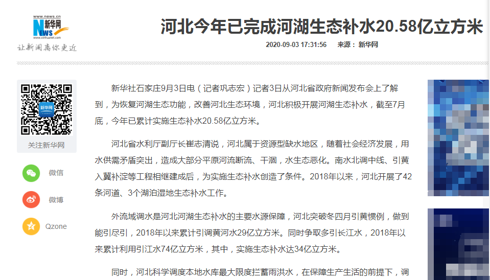 2018年以来,河北向滹沱河、滏阳河等42条河道实施生态补水累计达到53亿立方米,形成有水河长2300公里,形成水面面积137平方公里。向白洋淀补水10亿立方米,确保了白洋淀水位保持在7米左右,水面面积保持在250平方公里以上。