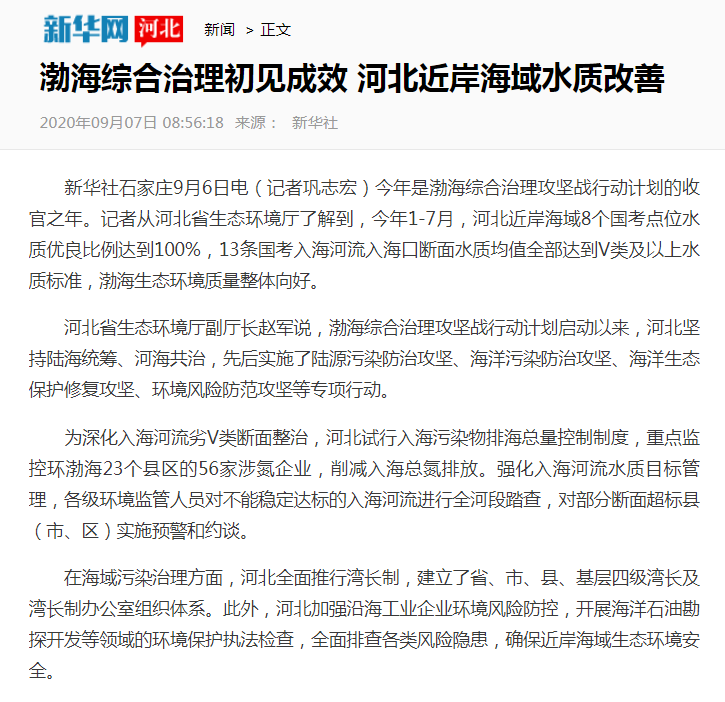 为深化入海河流劣V类断面整治,河北试行入海污染物排海总量控制制度,重点监控环渤海23个县区的56家涉氮企业,削减入海总氮排放。强化入海河流水质目标管理,各级环境监管人员对不能稳定达标的入海河流进行全河段踏查,对部分断面超标县(市、区)实施预警和约谈。