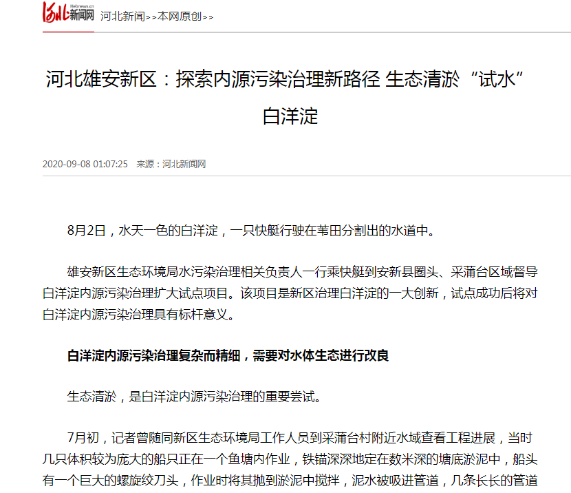 2019年,雄安新区在多次论证基础上,选择在安新县采蒲台村和南刘庄村2个代表性区域开展底泥内源污染治理试点(一期)。此后,新区委托中科院生态环境研究中心开展了专题研究,并组织编制《2020年白洋淀内源污染治理扩大试点实施方案》,根本任务是协同推进内源污染治理、生态本底修复和水动力改善,从而全面完成白洋淀规划中关于生态清淤试点要求。