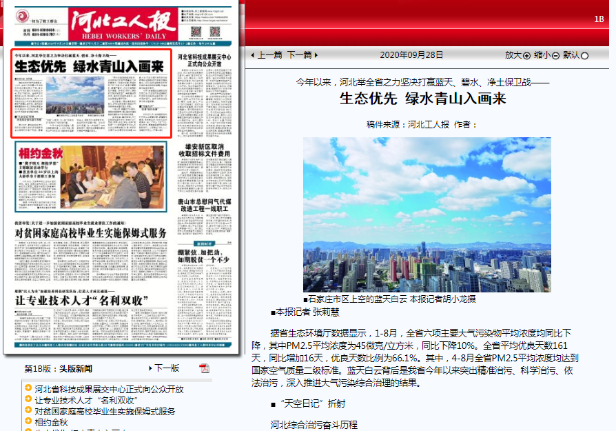 空气质量持续好转,蓝天白云渐成常态,人民群众蓝天幸福感持续增强。2020年上半年,河北省PM2.5平均浓度49微克/立方米,较去年同期下降15.5%,为2013年有监测记录以来历史同期最低值;空气质量综合指数平均为5.31,同比下降14.5%;优良天数为119天,同比增加15天;PM2.5平均浓度4、5、6月连续三个月达到国家空气质量二级标准。