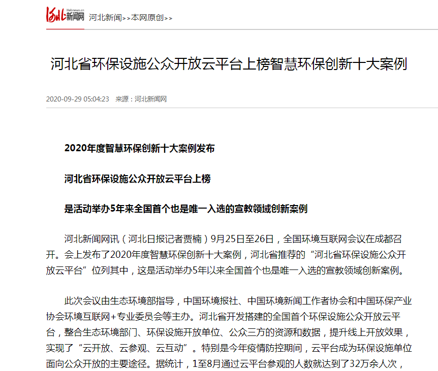 河北新闻网讯(河北日报记者贾楠)9月25日至26日,全国环境互联网会议在成都召开。会上发布了2020年度智慧环保创新十大案例,河北省推荐的“河北省环保设施公众开放云平台”位列其中,这是活动举办5年以来全国首个也是唯一入选的宣教领域创新案例。