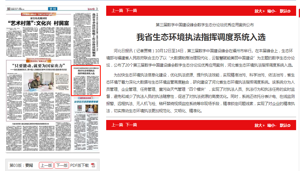 河北日报讯(记者贾楠)10月12日至14日,第三届数字中国建设峰会在福州市举行。在本届峰会上,生态环境部与福建省人民政府联合主办了以“大数据助推治理现代化,云智慧赋能美丽中国建设”为主题的数字生态分论坛,公布了20个第三届数字中国建设峰会数字生态分论坛优秀应用案例,成人视频 执法指挥调度系统入选。