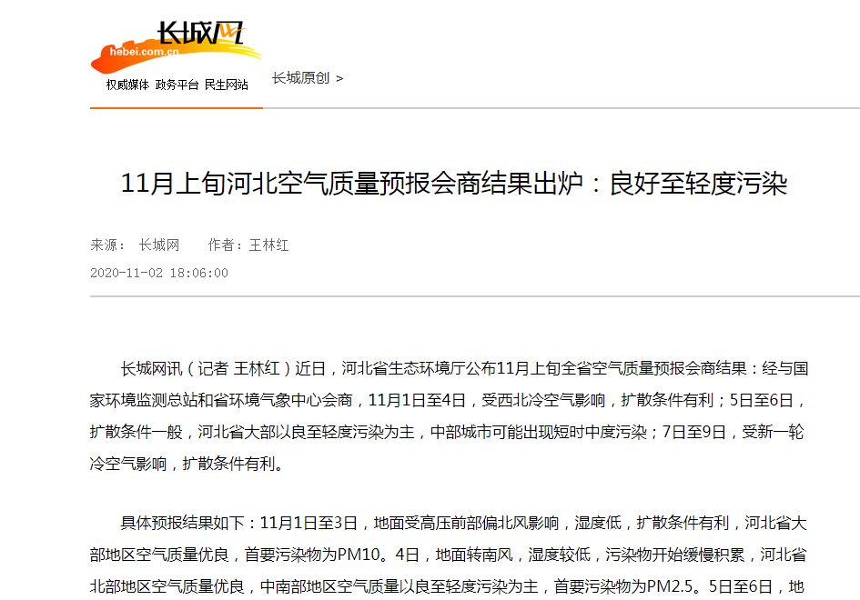 公布11月上旬全省空气质量预报会商结果:经与国家环境监测总站和省环境气象中心会商,11月1日至4日,受西北冷空气影响,扩散条件有利;5日至6日,扩散条件一般,河北省大部以良至轻度污染为主,中部城市可能出现短时中度污染;7日至9日,受新一轮冷空气影响,扩散条件有利。