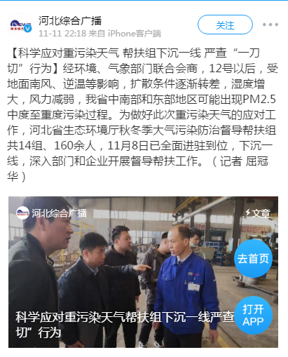 河北综合广播微博:科学应对重污染天气 帮扶组下沉一线 严查“一刀切”行为