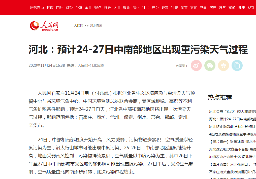 人民网:河北:预计24-27日中南部地区出现重污染天气过程