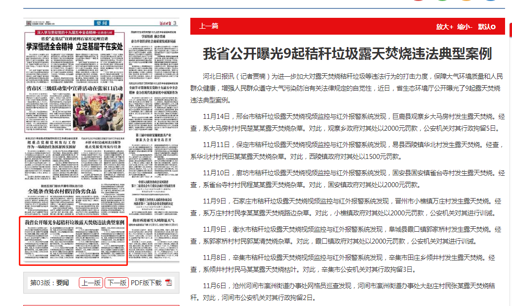 11月8日,辛集市秸秆垃圾露天焚烧视频监控与红外报警系统发现,辛集市田庄乡倾井村发生露天焚烧。经查,系倾井村村民马某某露天焚烧枯叶。对此,辛集市公安机关对其行政拘留3日。
