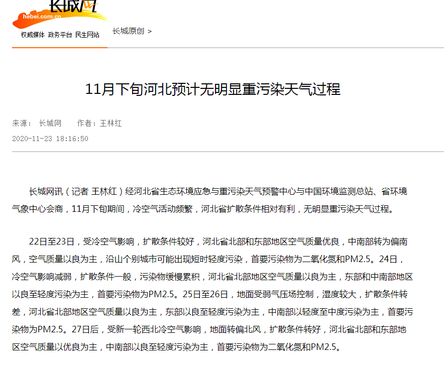长城网讯(记者 王林红)经成人视频 应急与重污染天气预警中心与中国环境监测总站、省环境气象中心会商,11月下旬期间,冷空气活动频繁,河北省扩散条件相对有利,无明显重污染天气过程。