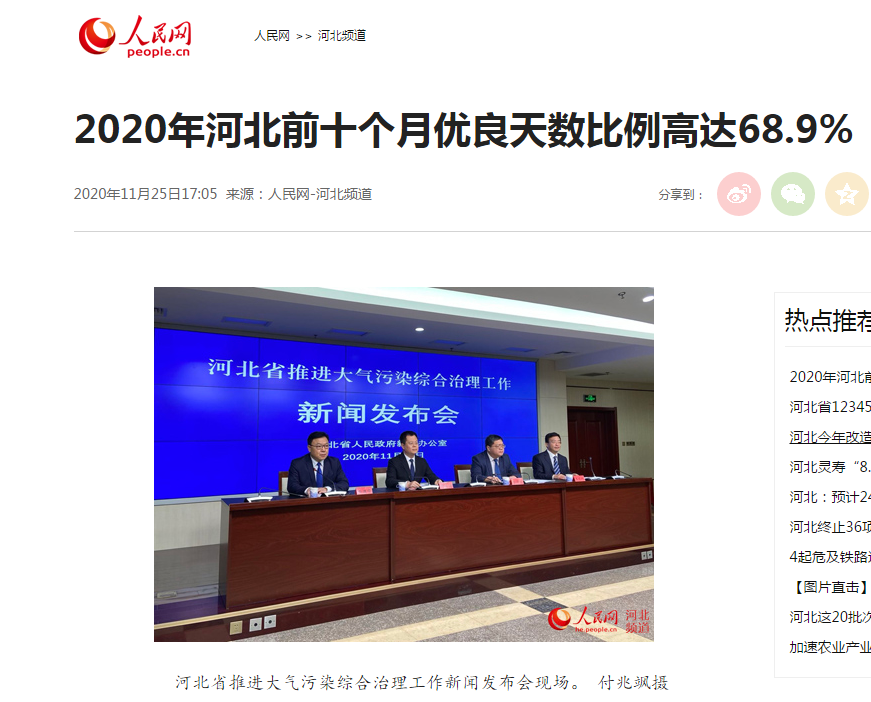 人民网:2020年河北前十个月优良天数比例高达68.9%