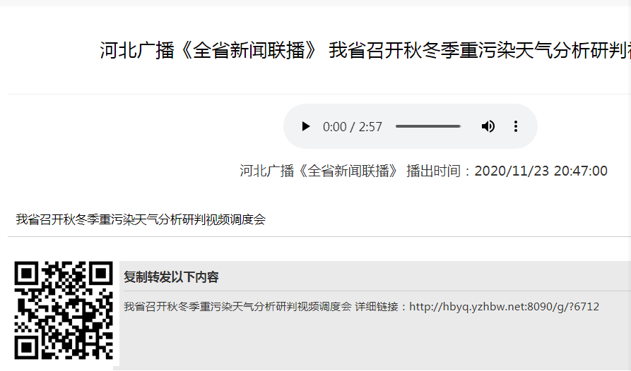 河北综合广播《全省新闻联播》:我省召开秋冬季重污染天气分析研判视频调度会,燃煤和机动车污染增加为上一轮重污染天气主要原因 来源:省生态环境宣传教育中心 时间:2020-11-26