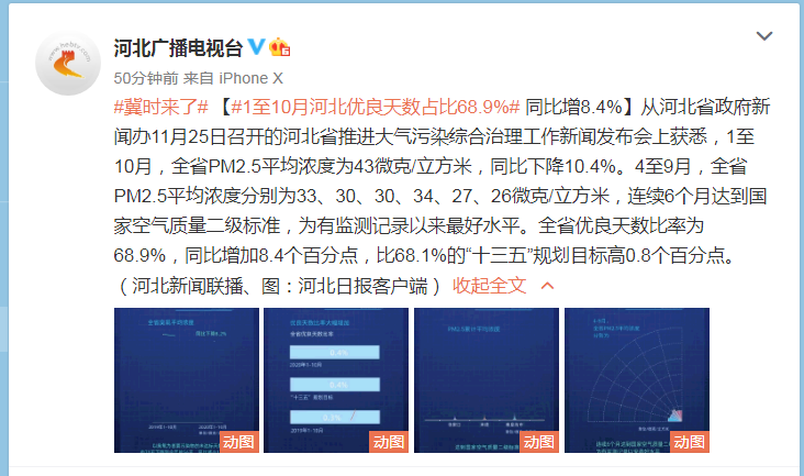 河北广播电视台微博:【#1至10月河北优良天数占比68.9%# 同比增8.4%】