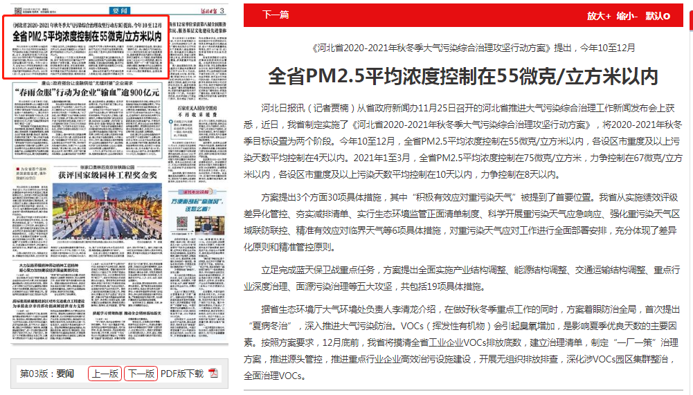 河北日报讯(记者贾楠)从省政府新闻办11月25日召开的河北省推进大气污染综合治理工作新闻发布会上获悉,近日,我省制定实施了《河北省2020-2021年秋冬季大气污染综合治理攻坚行动方案》,将2020-2021年秋冬季目标设置为两个阶段。今年10至12月,全省PM2.5平均浓度控制在55微克/立方米以内,各设区市重度及以上污染天数平均控制在4天以内。2021年1至3月,全省PM2.5平均浓度控制在75微克/立方米,力争控制在67微克/立方米以内,各设区市重度及以上污染天数平均控制在10天以内,力争控制在8天以内。