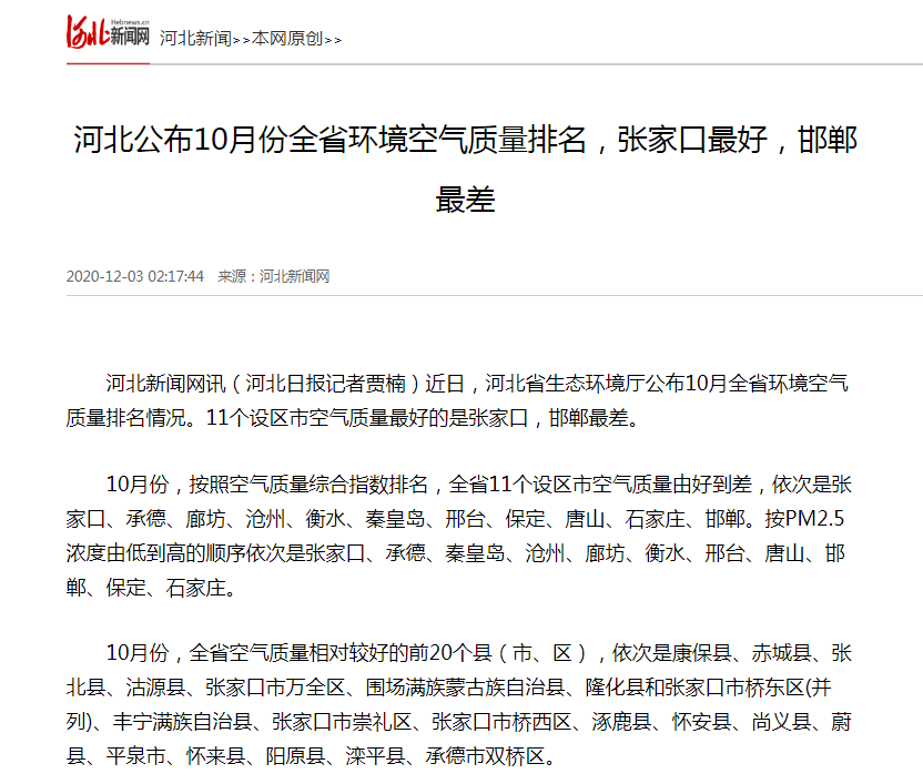 河北新闻网:河北公布10月份全省环境空气质量排名,张家口最好,邯郸最差