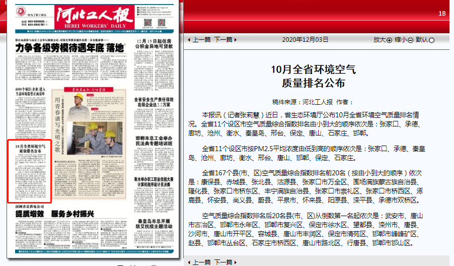 公布10月全省环境空气质量排名情况。全省11个设区市空气质量综合指数排名由小到大的顺序依次是:张家口、承德、廊坊、沧州、衡水、秦皇岛、邢台、保定、唐山、石家庄、邯郸。