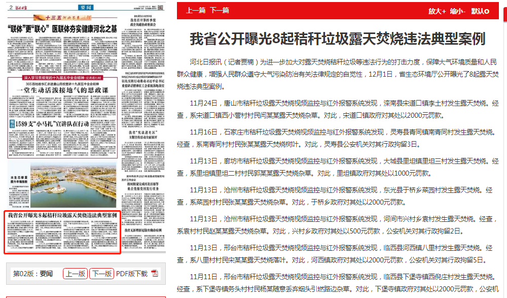 11月13日,沧州市秸秆垃圾露天焚烧视频监控与红外报警系统发现,东光县于桥乡菜园村发生露天焚烧。经查,系菜园村村民张某某露天焚烧杂草。对此,于桥乡政府对其处以2000元罚款。