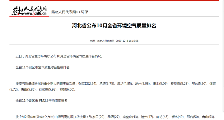 燕赵人民代表网:河北省公布10月全省环境空气质量排名 来源:省生态环境宣传教育中心 时间:2020-12-08