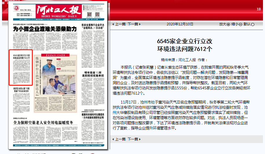 11月17日,沧州市处于重污染天气Ⅱ级应急预警期间,秋冬季第二轮大气环境帮扶执法专项行动沧州组对重污染天气应急减排措施落实情况进行执法检查时发现,沧州大华橡胶制品有限公司尽管已经按照重污染天气应急预警要求落实了减排措施,但在污染治理设施使用、环境管理等方面依然存在较多问题。对此,执法人员现场逐一对各项问题提出整改要求,下达了环境违法隐患提示函,并就有关法律法规对企业进行了宣教,指导企业提升环境管理水平。
