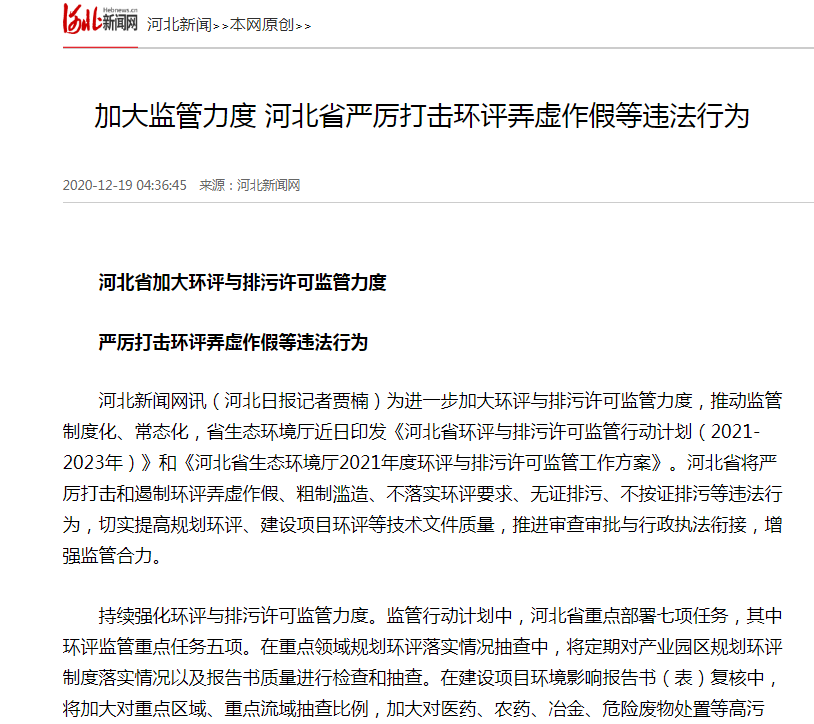 河北新闻网:加大监管力度 河北省严厉打击环评弄虚作假等违法行为