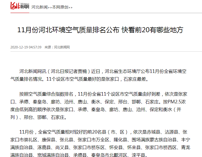 河北新闻网:11月份河北环境空气质量排名公布 快看前20有哪些地方