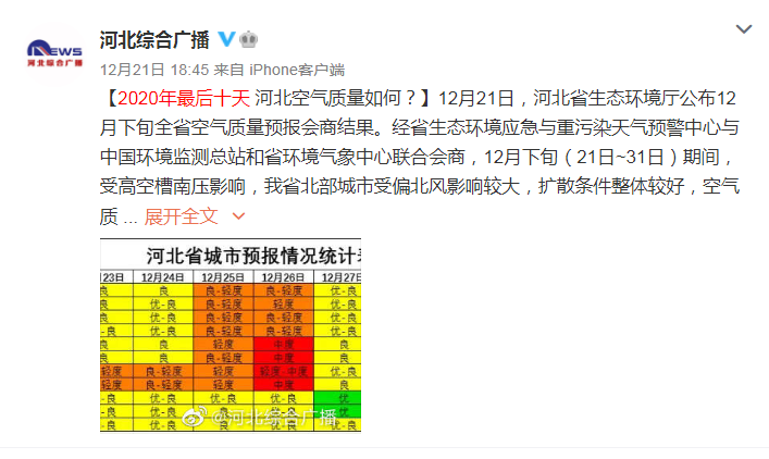河北综合广播微博:2020年最后十天 河北空气质量如何?