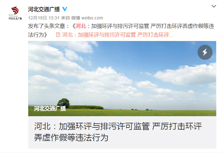 河北交通广播微博:河北加强环评与排污许可监管 严厉打击环评弄虚作假等违法行为