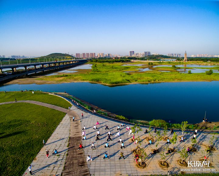蓝天白云下,市民们在滹沱河畔锻炼身体。成人视频 供图