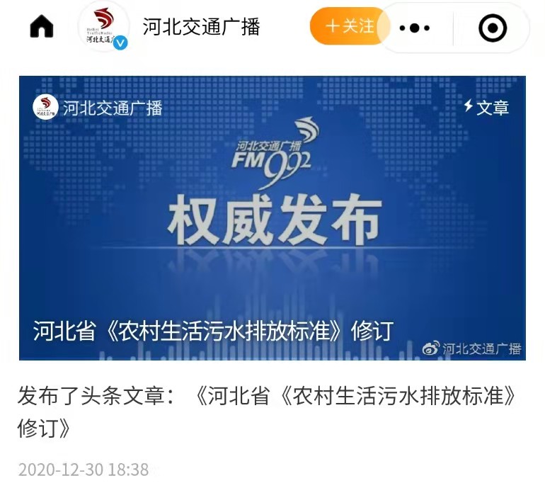 河北综合广播微博:河北修订《农村生活污水排放标准》,2021年3月1日施行