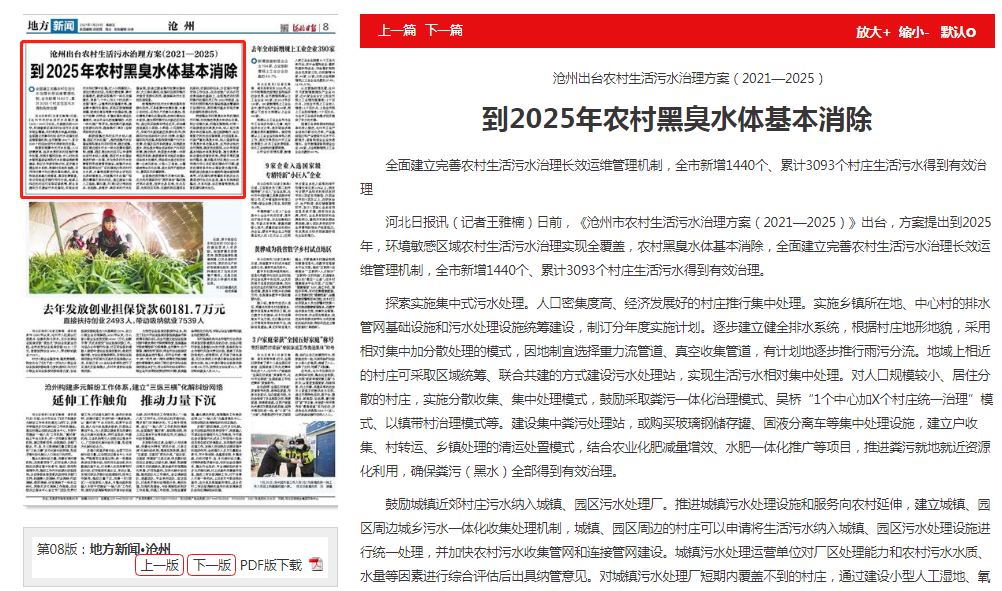 河北日报讯(记者王雅楠)日前,《沧州市农村生活污水治理方案(2021—2025)》出台,方案提出到2025年,环境敏感区域农村生活污水治理实现全覆盖,农村黑臭水体基本消除,全面建立完善农村生活污水治理长效运维管理机制,全市新增1440个、累计3093个村庄生活污水得到有效治理。
