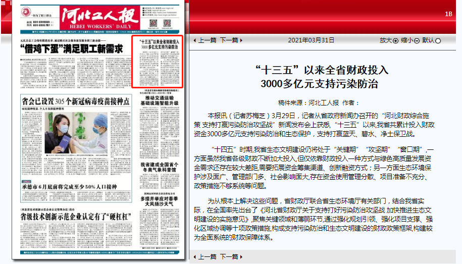 河北工人报:“十三五”以来全省财政投入3000多亿元支持污染防治