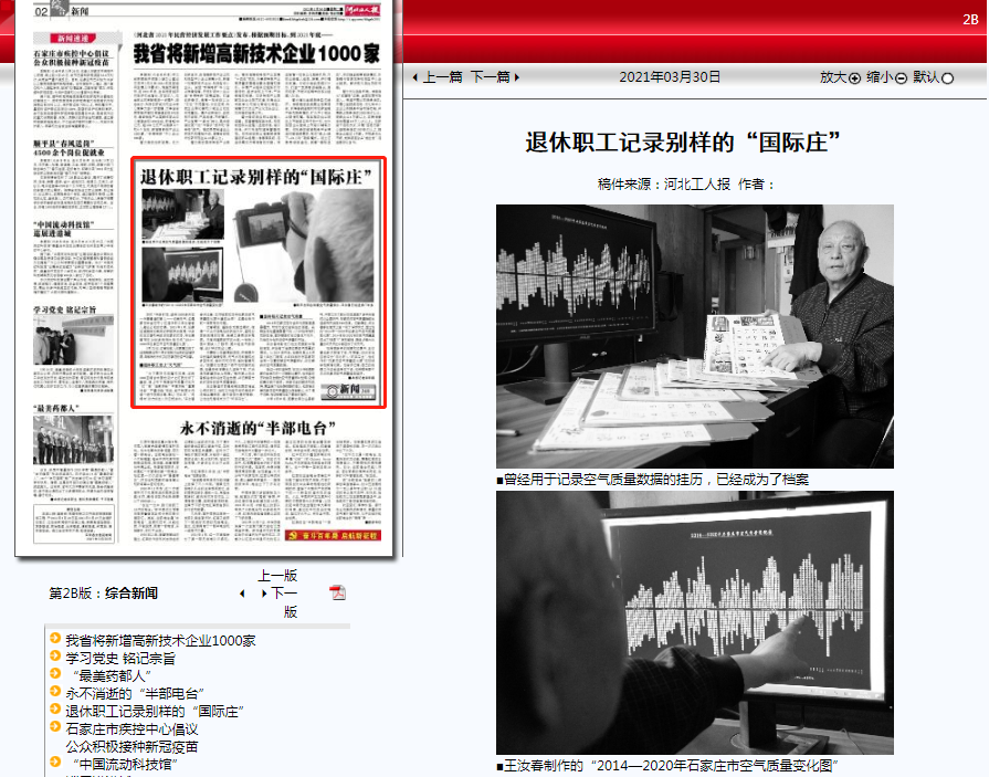 历时7年多时间,坚持2600多天做一件最普通的事儿——记录天气,这是家住省会石府小区退休职工王汝春老人每日必做的功课。2021年1月,石家庄遭遇突如其来的新冠肺炎疫情,76岁的王汝春利用封闭在家的时间,将记录留存的2500多张照片制作成“2014—2020年石家庄市空气质量变化图”。