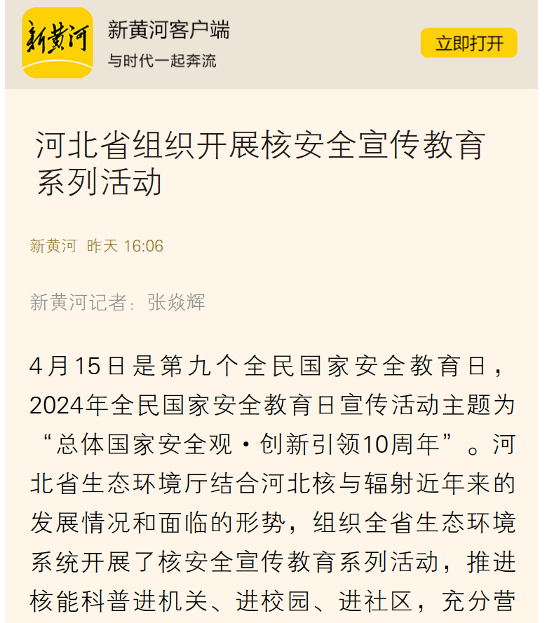 4月15日是第九个全民国家安全教育日,2024年全民国家安全教育日宣传活动主题为“总体国家安全观·创新引领10周年”。成人视频 结合河北核与辐射近年来的发展情况和面临的形势,组织全省生态环境系统开展了核安全宣传教育系列活动,推进核能科普进机关、进校园、进社区,充分营造科学认识,理性看待,人人维护国家安全的浓厚氛围。
