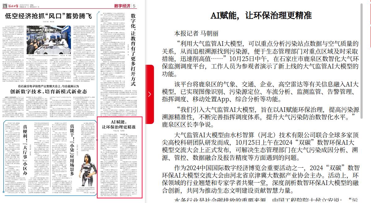 “利用大气监管AI大模型,可以重点分析污染站点数据与空气质量的关系,从而追根溯源找到污染源,便于生态管理部门对重点区域及时采取措施,迅速削高值……”10月25日中午,在石家庄市鹿泉区数智化大气环保监测调度平台,工作人员为参观者演示了新上线的大气监管AI大模型的功能。