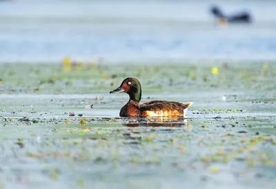 青头潜鸭体圆,头大,雄鸟头和颈黑色,并具绿色光泽,全球只有一千余只,绝大部分在我国境内,是极危物种、国家一级保护动物。