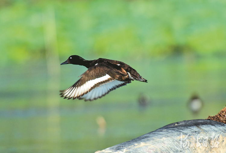 青头潜鸭在白洋淀水域飞翔。河北日报记者李东宇摄