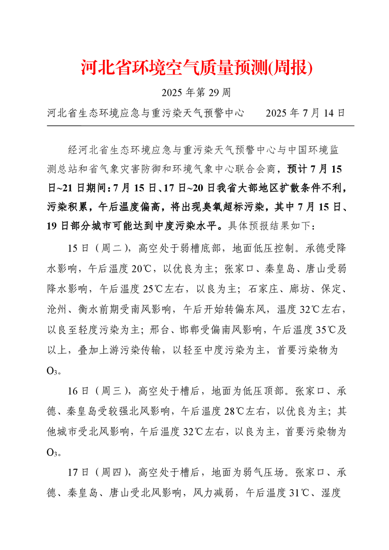 河北省空气质量预测报告(周报)2025年第29周