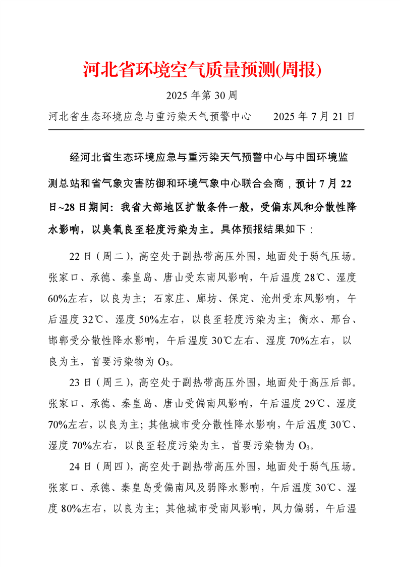 河北省空气质量预测报告周报2025年第30周