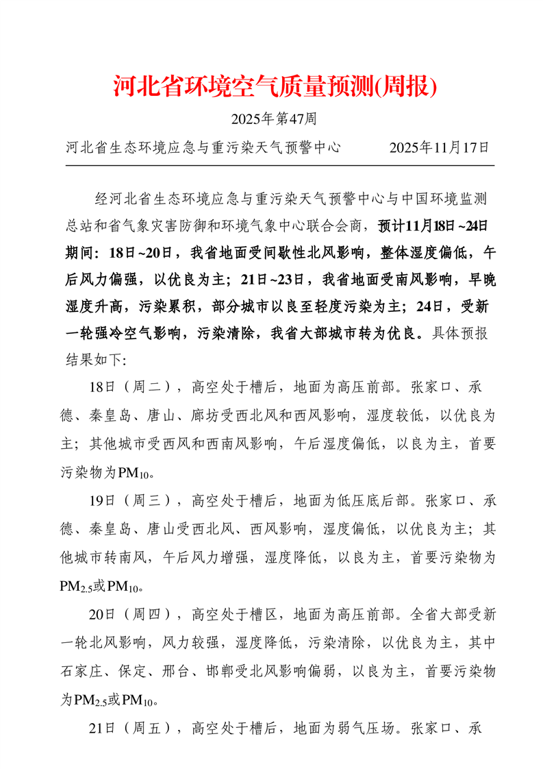 河北省空气质量预测报告周报2025年第47周