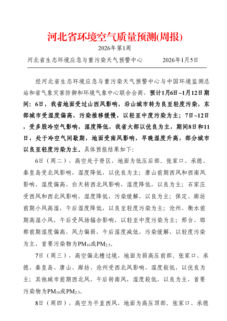 河北省空气质量预测报告(周报)2026年第1周